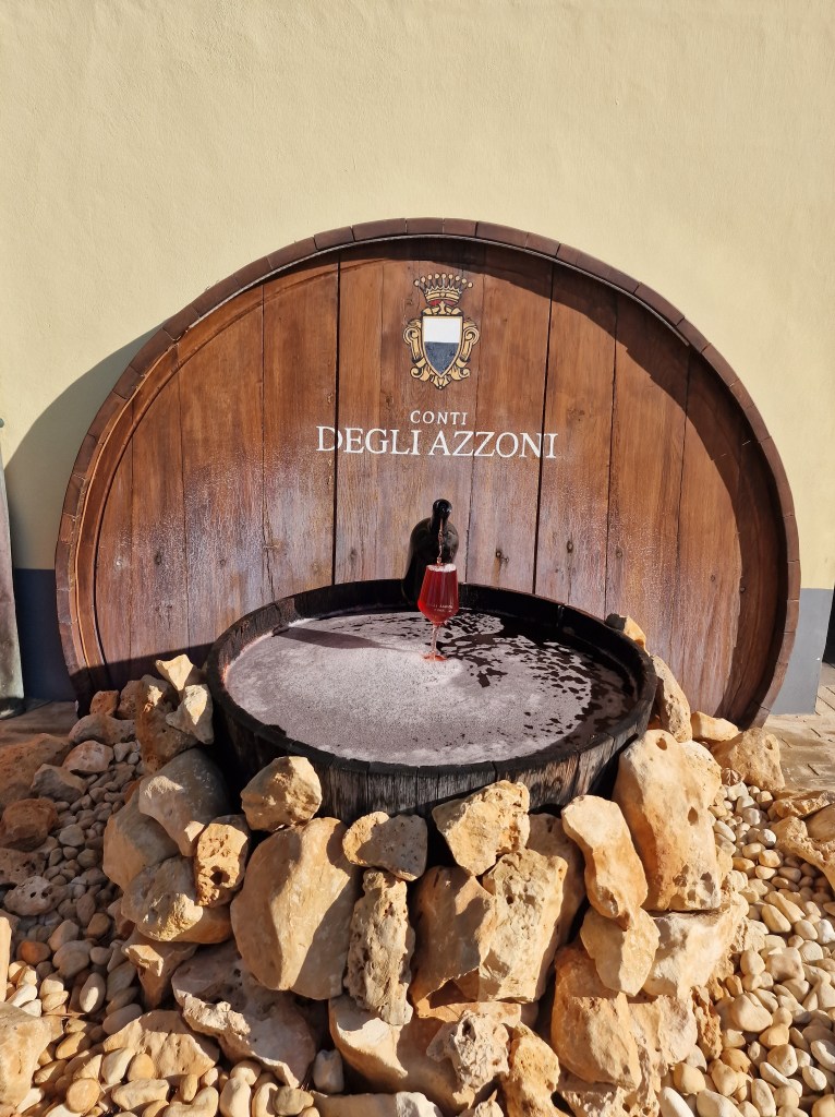 Ci spostiamo ai piedi del vigneto impiantato nel 1968 e che conta ben 22 cloni differenti. L’uva è Montepulciano ed è imbottigliato con il nome Passatempo. Un nome che ricorda lo scorrere del tempo, della vita e dell’affinamento in bottiglia ma anche, come in questo caso specifico, il piacere di passare del tempo prendendosi un momento per sé e per degustare davanti a questo panorama un eccellente prodotto.