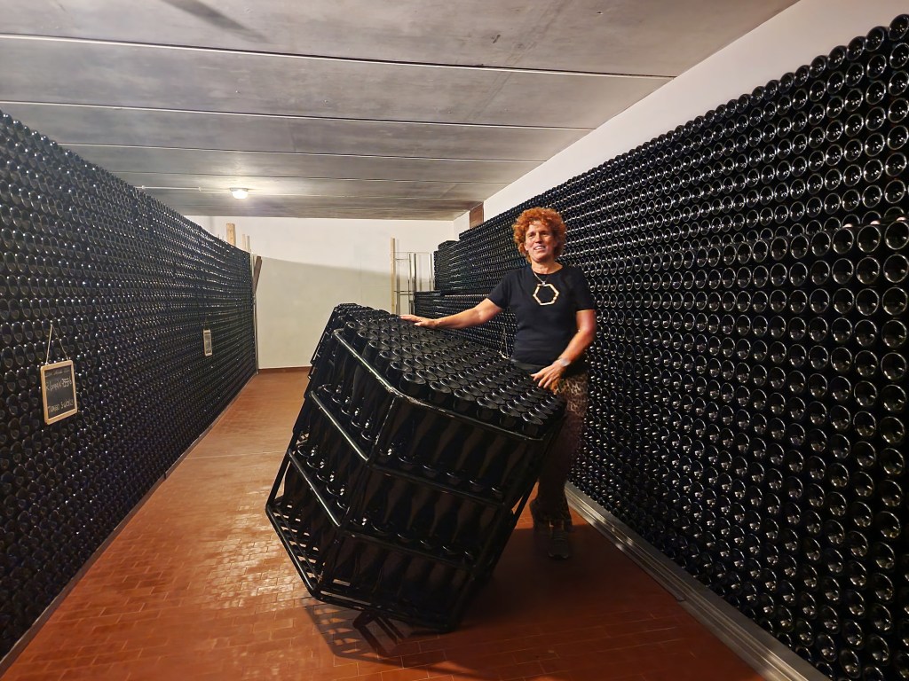 Ci accoglie Roberta Cecchin, una zazzera di ricci rossi e un carattere deciso che (ho scoperto successivamente) si riflette sui vini che produce. La cantina, che produce 20.000 bottiglie l’anno, prima ancora di essere tale è una casa dove sentirsi subito a proprio agio; capisco immediatamente perchè anche l’azienda si chiama così. Doveroso un giro nei vigneti e negli oliveti, per un totale di 8 ettari che si trovano sul versante vicentino dei Monti Lessini, nel comune di Montebello, sulla sommità di una collina alta circa 250 metri. Ci facciamo quindi guidare dai racconti di Roberta e visitiamo la cantina, dove viene tutt’ora utilizzato l’ingegnoso sistema dal papà per effettuare il remuage degli spumanti. Grandi esagoni capaci di eseguire un remuage “non manuale” di circa 273 bottiglie contemporaneamente e senza l’utilizzo dell’energia elettrica.