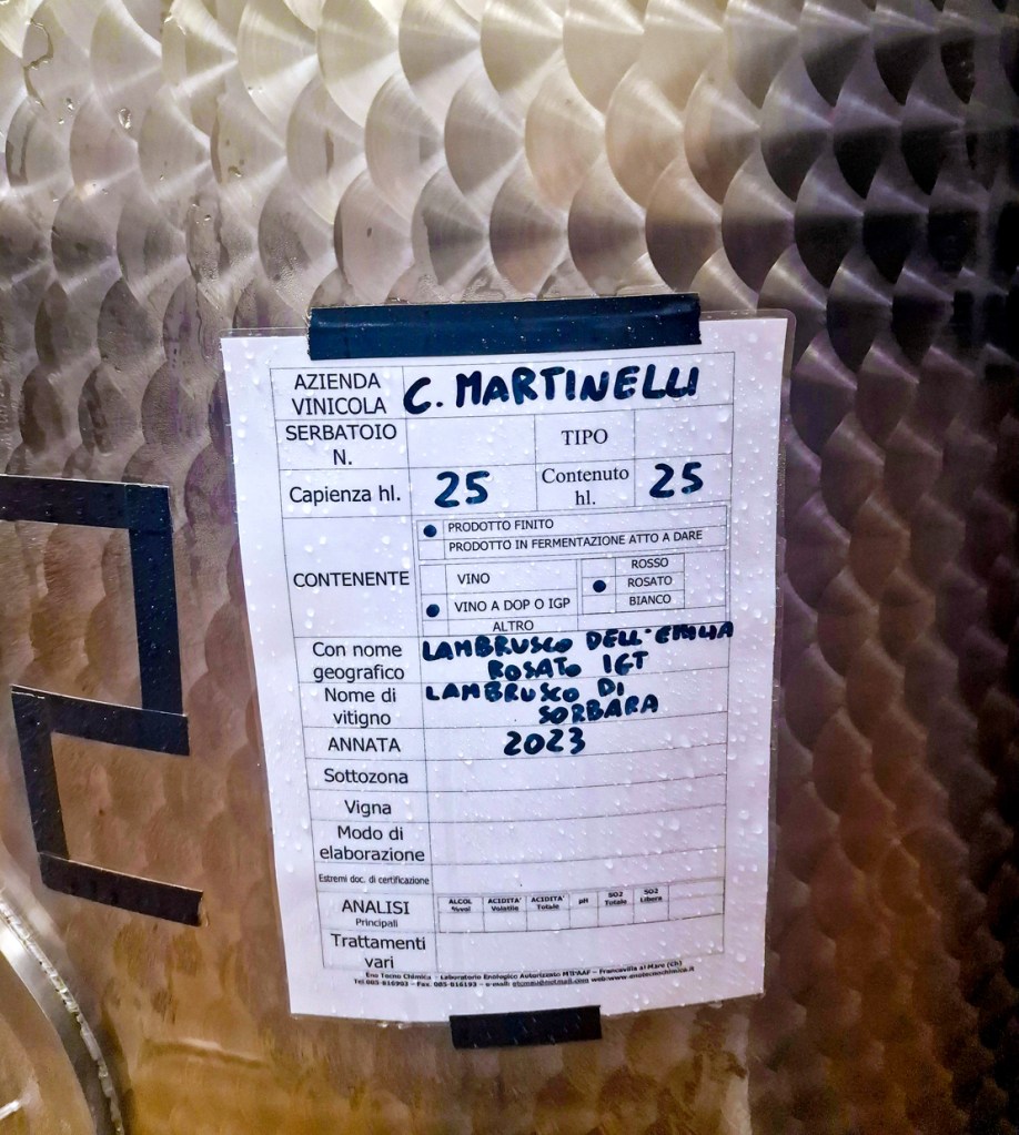 Lambrusco dell’Emilia Rosato IGT (100% Lambrusco di Sorbara e 12,5 % vol.).