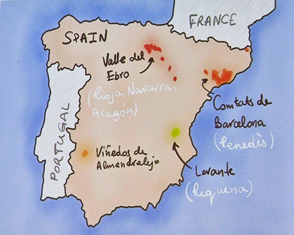 Le zone di produzione delle bollicine spagnole sono Rioja, Aragona, Navarra, Valencia ed Extremadura. Il nome Cava fu scelto quasi per caso nel 1959, quando la Francia vietò l’uso della terminologia ‘Champagne’ per designare il suo spumante. In spagnolo “cava” significa cantina e i consumatori si riferivano all’omonimo vino utilizzando termini come “vino spumante invecchiato in cava”. La D.O. Cava comprende quattro distretti della Spagna, ovvero Comtats de Barcelona, Zona del Levante, Valle del Ebro e Vinedos de Almendralejo, ma il cuore pulsante della produzione è a pochi chilometri da Barcellona, nel Penedès, luogo di produzione di grandi Spumanti Metodo Classico.