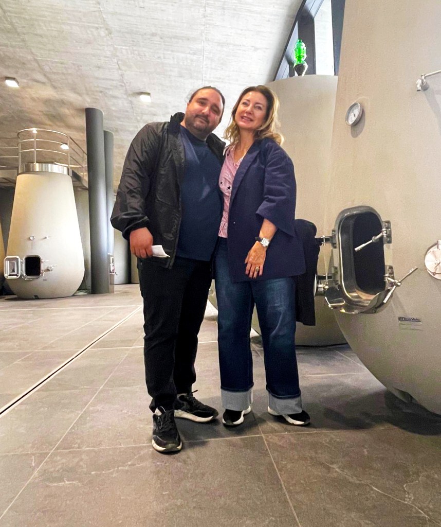 La mano dell’architetto si apprezza nel progetto geotermico e ipogeo (la cantina è sotterranea, sotto il vigneto), nella ricerca convinta della sostenibilità, nelle linee pulite, nella scelta di pochi materiali come l’acciaio e il vetro e nell’uso di piante verdi. Il progetto include anche la ristrutturazione di un agriturismo con piscina riscaldata e punto ristoro. Solo a casa, scopro che hanno ricevuto il premio “Cantina Emergente” per la guida ‘Vini d’Italia 2024’ del Gambero Rosso, oltre che quello come roduttore emergente secondo la ‘Guida Essenziale’ di Doctor Wine di Daniele Cernilli. Considerando che il 2020 è l’anno della prima vendemmia di Edoardo, come esordio mi sembra veramente entusiasmante. Luca, dal canto suo, ha avuto la grande sensibilità di cogliere il fuoco che ardeva in Edoardo e di lasciargli le redini della conduzione della cantina. Un padre che ha sposato totalmente il progetto del figlio e che ha creduto in lui.