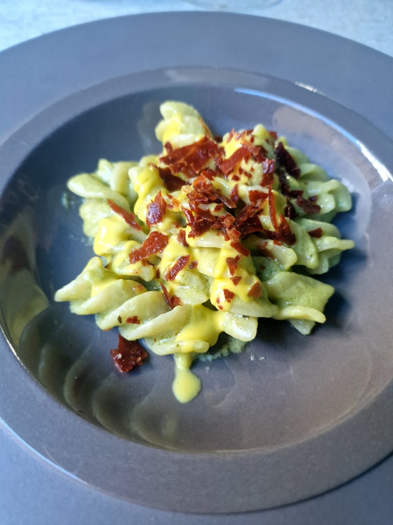 - Fusilli con pesto di asparagi, salsa allo zafferano e prosciutto croccante