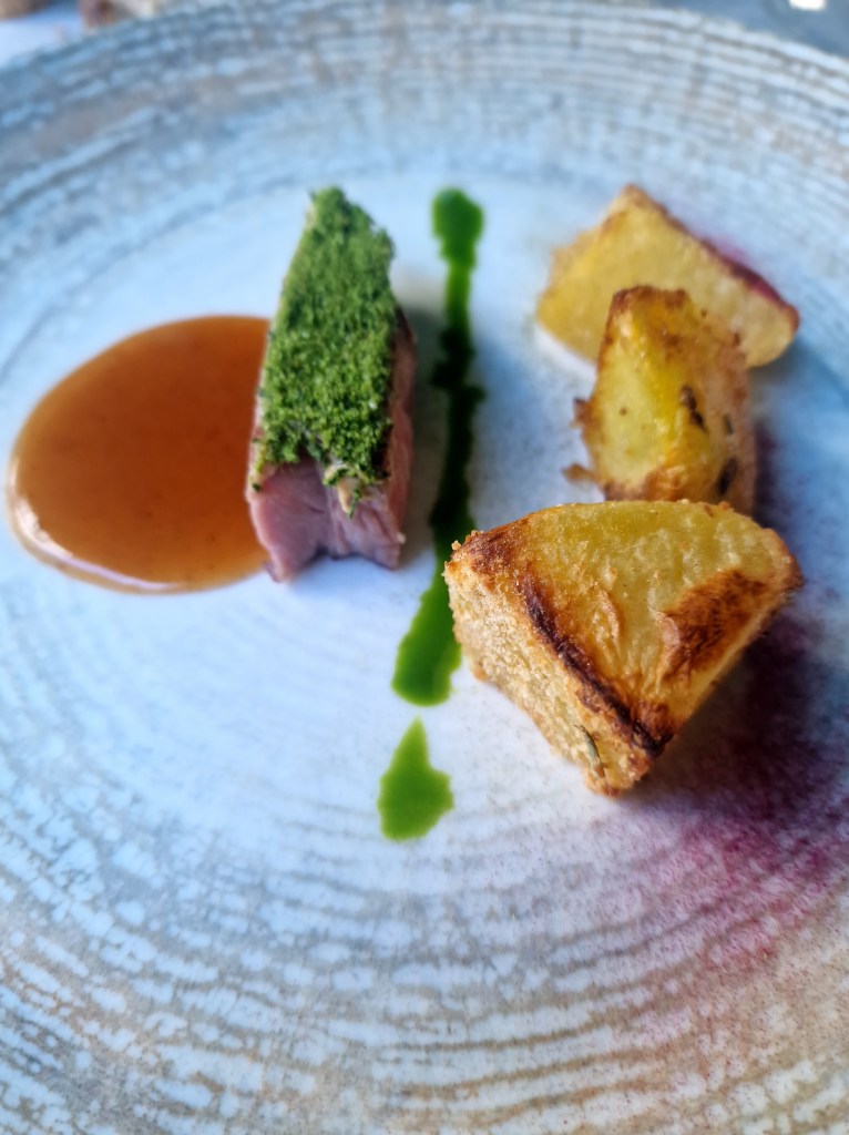 - Black Angus americano in crosta di erbette, senape, fondo bruno e patate sabbia