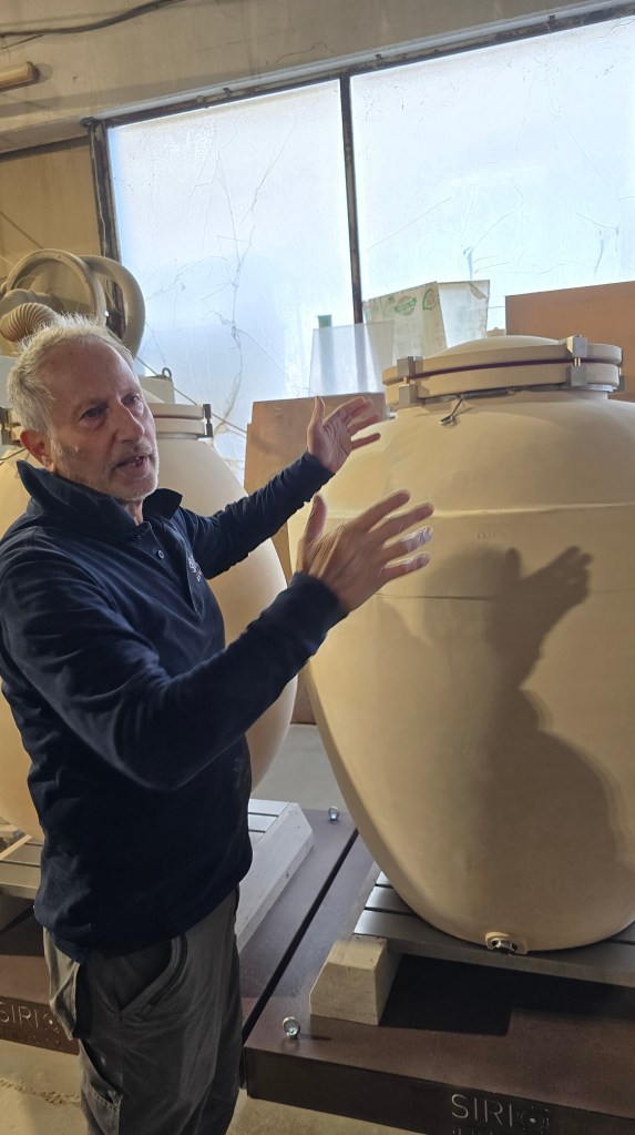 Oggi Sirio vanta 18 distributori nel mondo, dove finisce l’80% della produzione. Fabrizio è ottimista, convinto che “la torta è grande” e che malgrado le sue anfore durino per sempre (non come le barrique che dopo qualche passaggio devono essere sostituite) è sicuro che la clientela non mancherà. Passiamo poi a vedere tutte le fasi di lavorazione, i cui vari passaggi sono peraltro ben spiegati sul loro sito, e capiamo perché le anfore abbiano un certo costo…