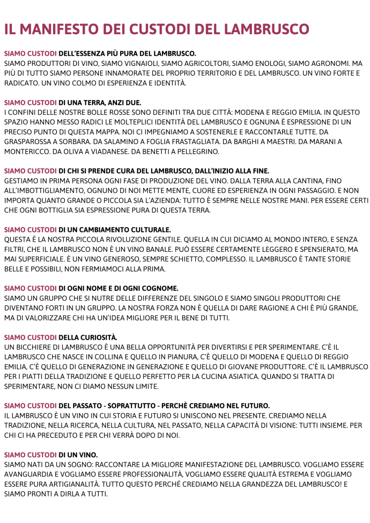 Un vino che risale al 187 A.C. e che viene prodotto con visioni e stili aziendali diversi partendo da varietà differenti, pur tendendo costantemente negli anni alla ricerca della qualità. La qualità quindi è il comune denominatore e i Custodi puntano a riscrivere la storia di uno dei vini più rappresentativi dell’Emilia-Romagna con un linguaggio contemporaneo, diretto e sensibile alle novità. Dalla vigna alla bottiglia, ogni scelta sarà dettata da un principio chiave: esaltare il carattere autentico del Lambrusco, elevandone la qualità e rendendone unica ogni espressione.