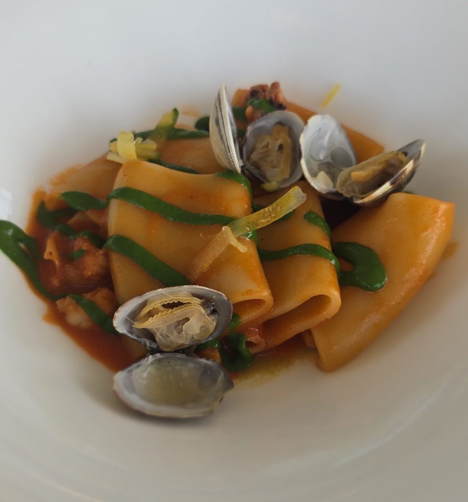 Pacchero alla pescatora mazzancolle, calamari, vongole, prezzemolo