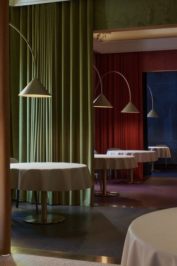 Gli ambienti, fluidi e comunicanti, sono suddivisi da tendaggi drappeggiati in velluto in colori accesi (verde acido, rosa, blu, grigio, arancio), che conferiscono un’atmosfera teatrale e intima. Anche il personale indossa una divisa che richiama il teatro. Forse a ricordare che qui vivrai un sogno fatto di gioco e di contrasti e che sarai parte di una “scena” che risveglierà la mente e il palato. Nulla è come sembra, così è se vi pare, sarà questa ambientazione teatrale che mi ricorda un po’ Pirandello, dove tutto è sorpresa.