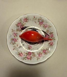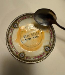 Essendo il menù “al buio”, ho giocato alla cieca anche con gli abbinamenti di vino, lasciandomi guidare da chi sapeva meglio di me cosa avrei mangiato. Abbiamo iniziato a giocare con le emozioni nel vero senso della parola. Tanti piattini, ognuno con un significato scritto al di sotto e quindi leggibile solo a piatto vuoto.