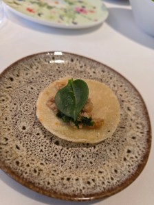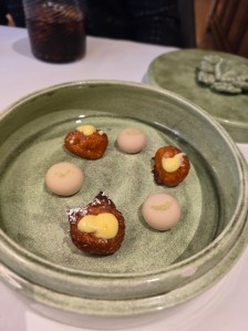 La chiusura è un classico confortante ma originale: una Tarte Tatin servita con gelato al latte di capra e lavanda, seguita da una piccola pasticceria contenuta in uno scrigno di ceramica, dove spicca il cremoso al lampone con polvere di wasabi, un ultimo guizzo creativo prima dei saluti.