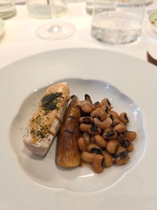 Pesce Spada e Scampi: un piatto complesso, dove il miso e i fagioli dall’occhio nero creano una profondità umami che avvolge il pesce scottato magistralmente.