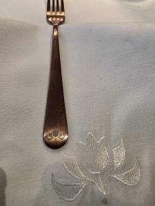 Non vi fate ingannare dalla sapiente ristrutturazione esterna ed interna. In realtà il locale nasce dalle ceneri di un devastante tornado che nel 2015 ha lasciato solo macerie e distruzione – ce lo ricorda una targa in marmo posta all’esterno. All’interno, l’ambiente è minimalista ma accogliente. Il design gioca su una palette di colori neutri (tortora, grigio antracite e toni caldi del legno) e la mise en place è particolarmente curata, essenziale e moderna con ceramiche artigianali che richiamano i colori della terra e del mare. Le posate riportano il logo del locale, un fiore stilizzato, che ho ritrovato nel ricamo del tovagliolo. Questo mi ha fatto pensare subito a una cura attentissima ai dettagli, cosa che ho infatti poi ritrovato nei piatti.