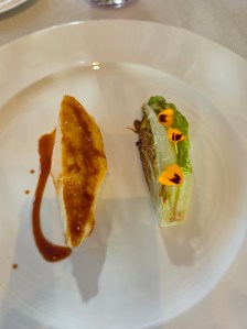 - Petto di polletto bio tenerissimo, esaltato da una jus profonda e dalla lattuga scottata.