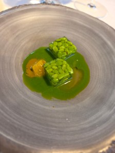 Piselli con anemone di mare e carruba. Aspic di distillato di baccello di pisello alla brace, pisello crudo, anemone di mare, carruba e arancia