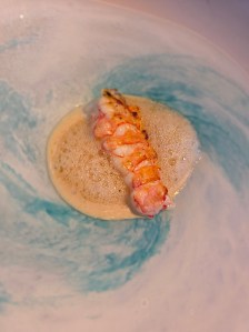 Scampo con salsa artemisia, aria di vaniglia e burro noisette